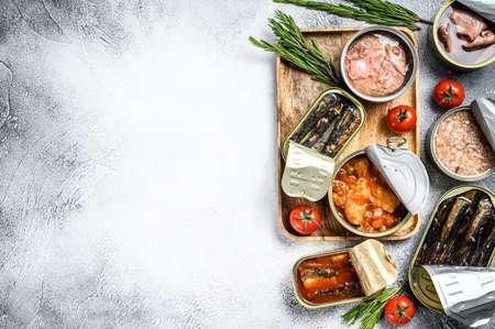 Tin can of sprats, sardines set, on white stone table background, top view flat lay, with copy space for text