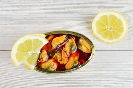 tin pickled mussels, slice lemon and fork on gray marble