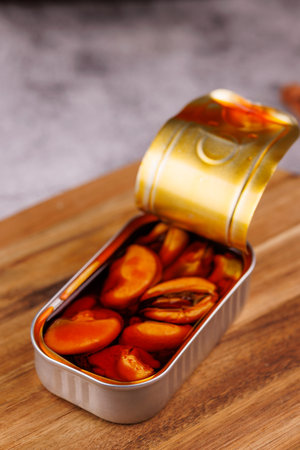Can of mussels on rustic wooden table