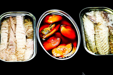 Assortment of cans, canned with different types of fish and seafood. Black background. Top view.