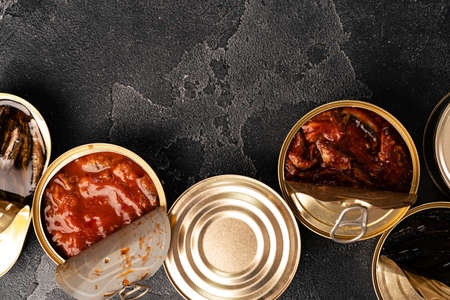 Canned conserve products in tin cans. with fresh organic ingridients Saury, mackerel, sprats, sardines, pilchard, squid, tuna pinapple, corn, peas, mango , beans, over black stone textured background top view space for text side by side concept.