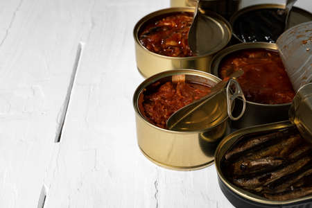 Assortment of open tin cans for a healthy dinner