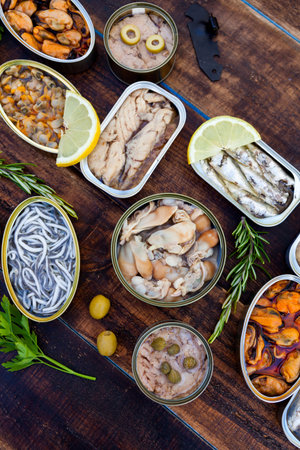 Assortment of cans of canned with different types of fish and seafood on rustic wooden table