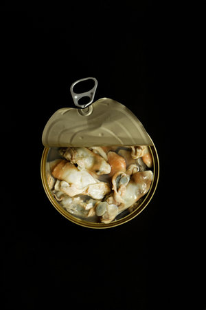 Mussels over black background. Conserve / Canned / Tinned sea food
