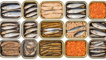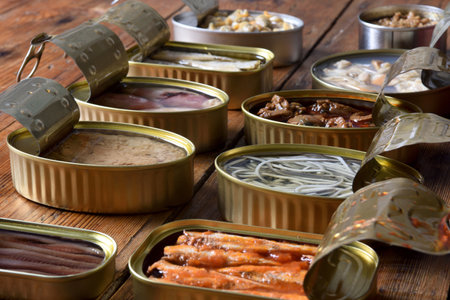 A collection of canned foods, including fish, meat, vegetables, and fruit