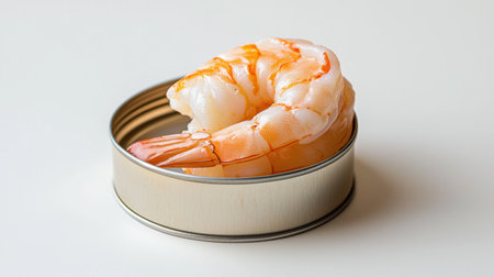 A clean white background featuring a fresh shrimp and an elegant metal can, creating a minimalist food scene.