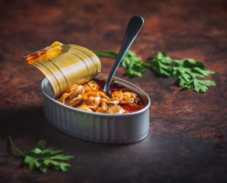 Canned scallops with sauce open on a dark brown table with a fork and parsley. Ready to eat.