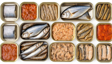Assorted canned fish in a tin sardine, smoked sardine, mackerel. Isolated on white background