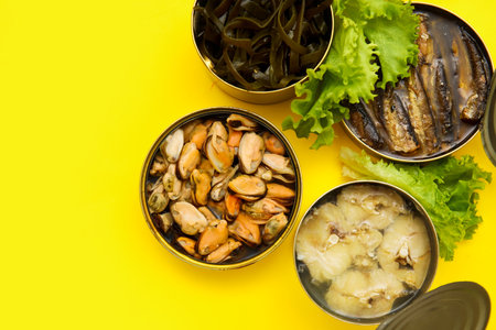 Opened tin cans with different seafood on yellow background
