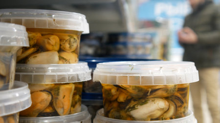 Close-up of many plastic containers with mussels in marinade and a male buyer chooses one behind them