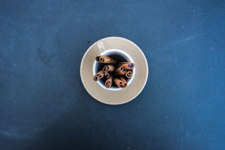 Coffee mug full of organic cinnamon sticks on dark background with copyspace