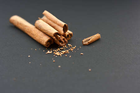 cinnamon sticks close up on dark background.