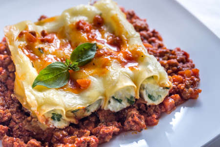 Delicious meat cannelloni pasta isolated on white background