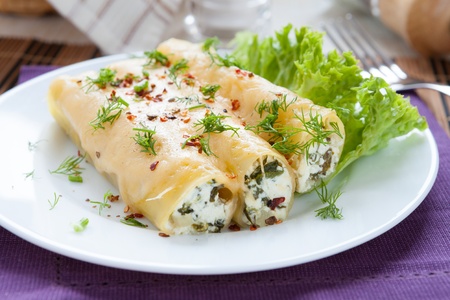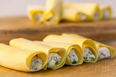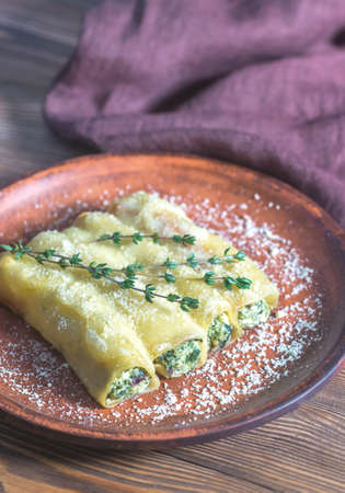 Close up to cannoli pasta stuffed with spinach and feta cheese,selective focus