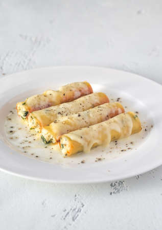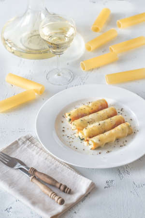 Cannelloni stuffed with ricotta on the white plate