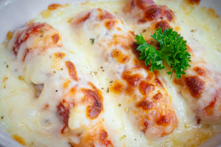Cannelloni with bechamel sauce and melted mozzarella cheese in a white ceramic plate