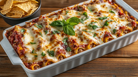 A vibrant dish of freshly prepared lasagna topped with melted cheese and basil sits next to a bowl of crunchy tortilla chips. The rustic wooden table adds warmth and charm to the setup.