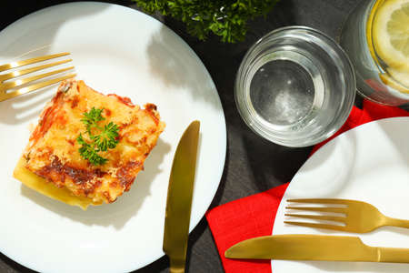 Concept of delicious food, lasagna, space for text