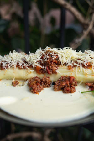 dish with cannelloni in white sauce and bolognese sauce with grated parmesan