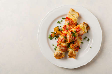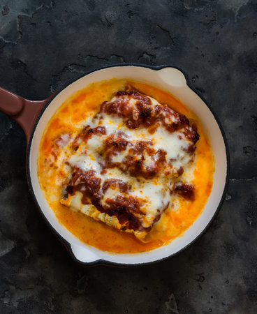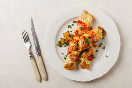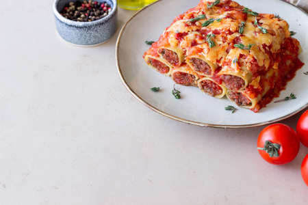 Traditional baked cannelloni with meat filling and sauce on a stone background. Selective focus. Top view.
