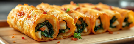 Crispy stuffed tortillas filled with spinach and cheese on a wooden serving board
