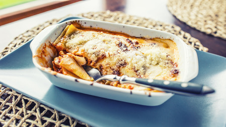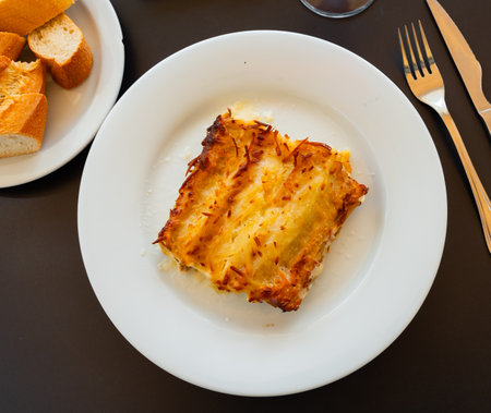 Portion of Lasagme bolognese in dish on table in restaurant.