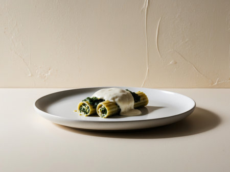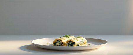 Cannelloni with spinach and creamery cheese on a white plate on a light background. Generative AI illustration