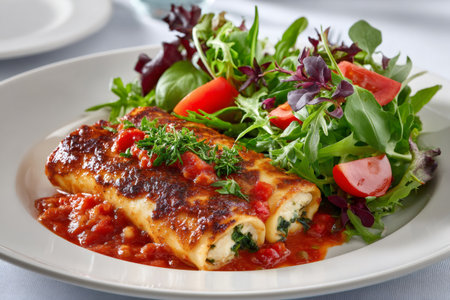 Cannelloni pasta filled with ricotta and spinach, topped with tomato sauce and fresh herbs, served with a side salad