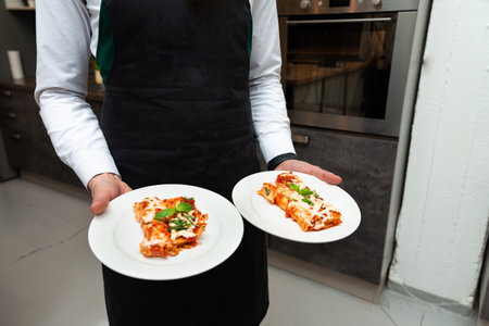 A waiter in a black apron presents two plates of freshly baked lasagna garnished with basil, ready to be served.