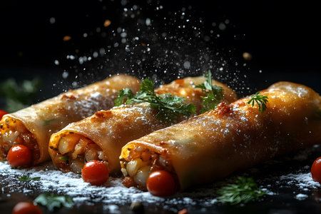 Three gourmet vegetable spring rolls filled with a colorful medley of vegetables, garnished with fresh herbs and vibrant cherry tomatoes. captured with flour elegantly dusting over them, creating an appealing culinary presentation. Generative AI