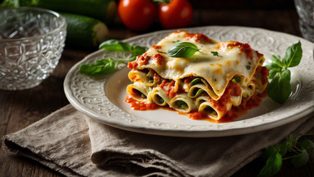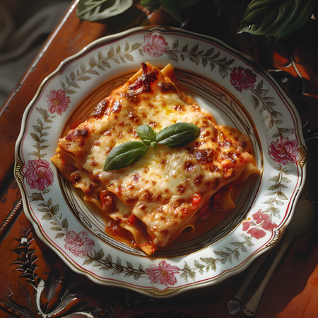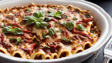 Delicious lasagna topped with fresh basil on a plate