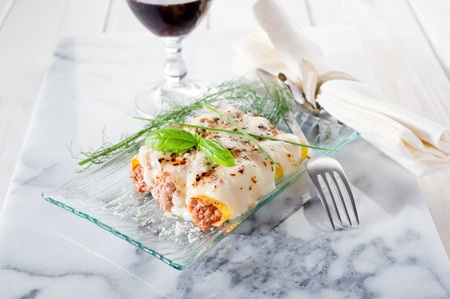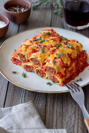 Cannelloni with meat, cheese, tomatoes and thyme. Italian food
