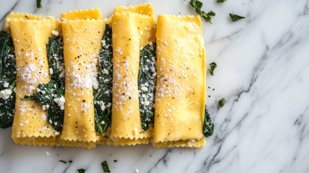 Delicious pasta dish filled with spinach and topped with cheese on a marble surface