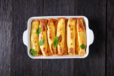 blintz, rolled filled with sweetened cottage cheese pancakes or crepes in a baking dish on a wooden table, horizontal view from above, flat lay