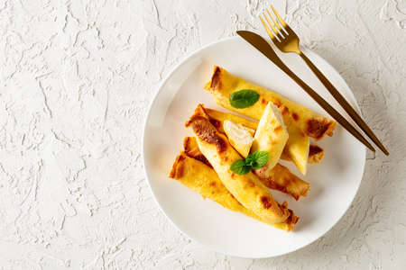 blintz, rolled filled with sweetened cottage cheese pancakes or crepes on a white plate on a wooden table, horizontal view from above, flat lay, free space