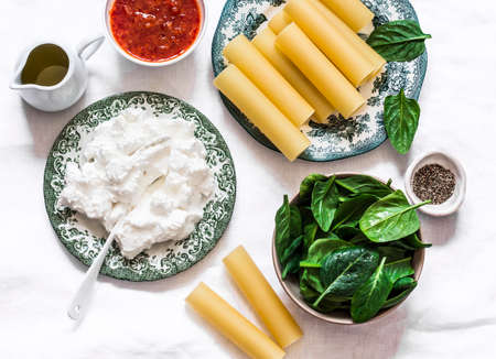 Ingredients for making cannelloni with spinach and ricotta baked with tomato sauce and mozzarella on a light background, top view