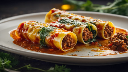 cannelloni on a plate with meat and tomato sauce