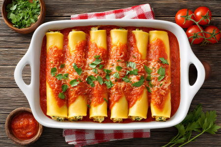 AI Generated. Delicious Baked Cannelloni with Tomato Sauce and Cheese