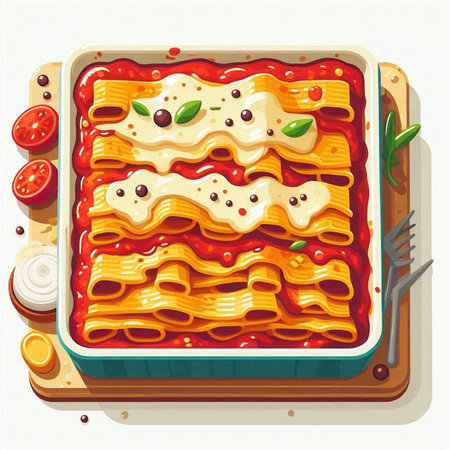 Illustration of lasagna with tomato sauce and cheese in a baking dish