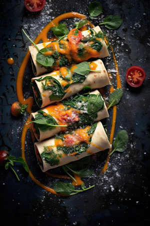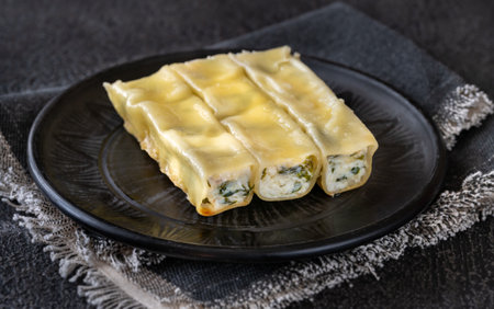 Spinach and ricotta cannelloni vegetarian dish on black stone surface background. Generative AI art