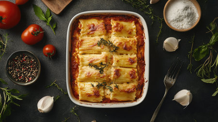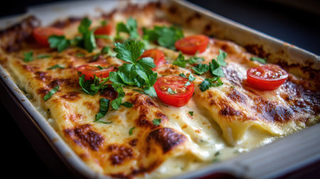 A mouthwatering view of baked cannelloni pasta layered with creamy sauce, garnished with cherry tomatoes and fresh herbs, ideal for culinary delights and cooking visuals.