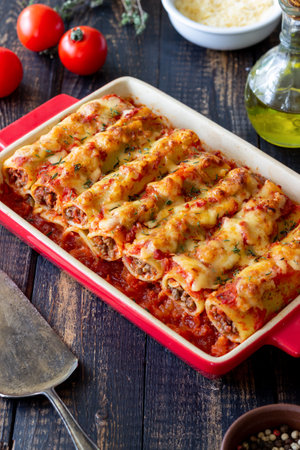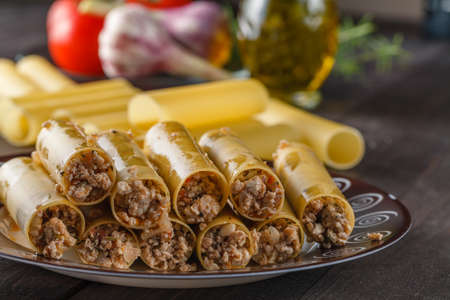 Italian cannelloni pasta with minced meat and tomato sauce on the old table