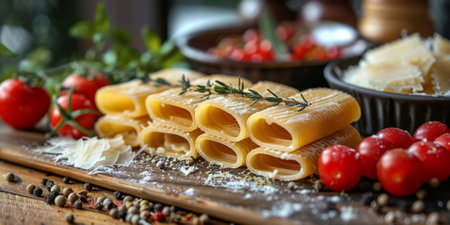 Italian pasta cannelloni. Raw tube for stuffing stuffing surrounded by ingredients for cooking, parmesan cheese, tomato, minced meat on a white wooden table
