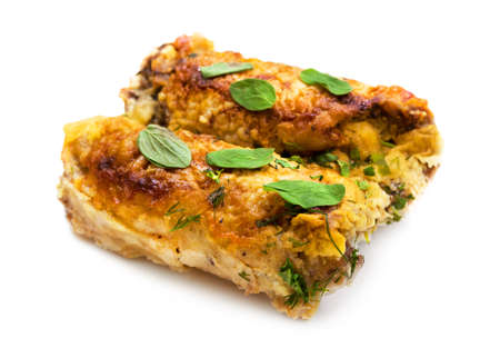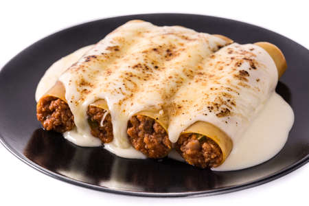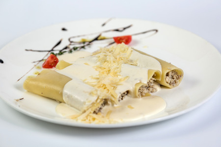 Delicious meat filled with a pasta on a plate on a white background. Italian cannelloni, Spanish canelones.