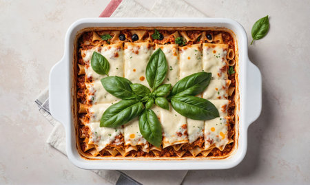 Savor the enticing layers of homemade lasagna topped with aromatic basil leaves.