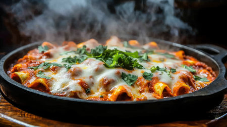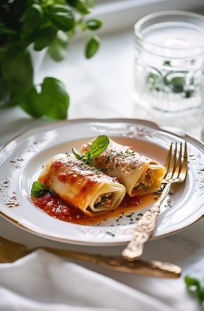 AI Generated. Delicious baked cannelloni with marinara sauce and herbs