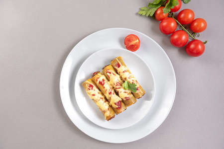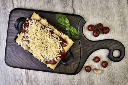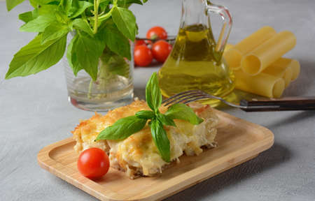 Italian dish cannelloni with meat cheese and tomato sauce on a gray background