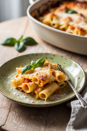 AI Generated. Delicious Baked Pasta Dish in Cozy Atmosphere