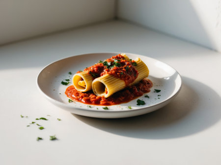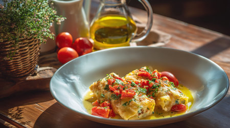 A delicious plate of homemade cannelloni stuffed with fresh herbs and topped with cherry tomatoes, drizzled with olive oil, showcasing a vibrant culinary experience.