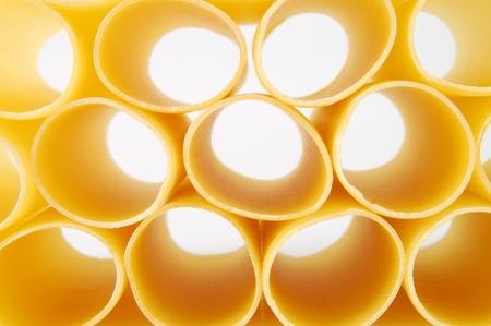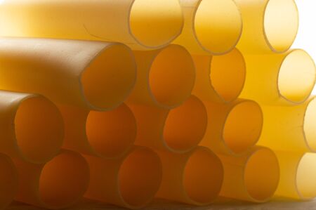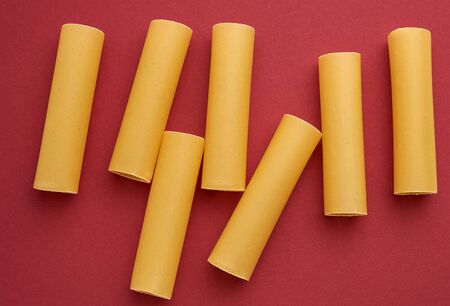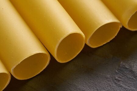 Abstract top view of yellow big tubes of raw cannelloni Italian pasta. Food art style. Macro shot